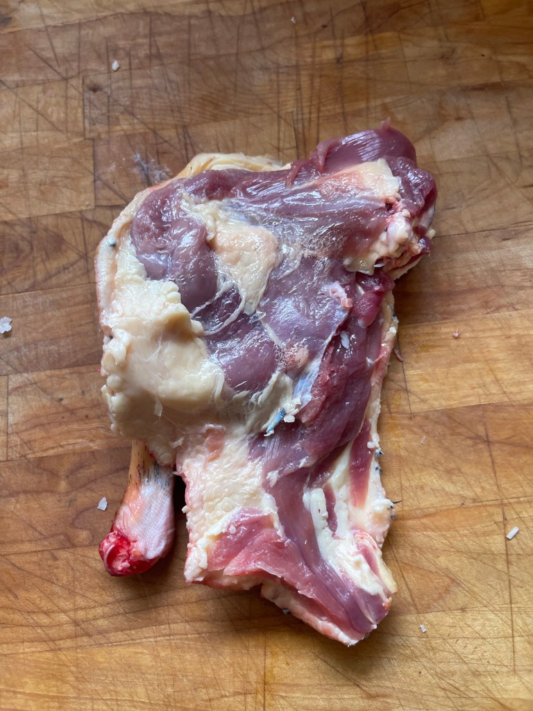 A significant amount of fat is on the bottom of the leg. Cut away fat on the bottom of the legs and edges of the breasts to add to a pot for rendering with all other trimmings